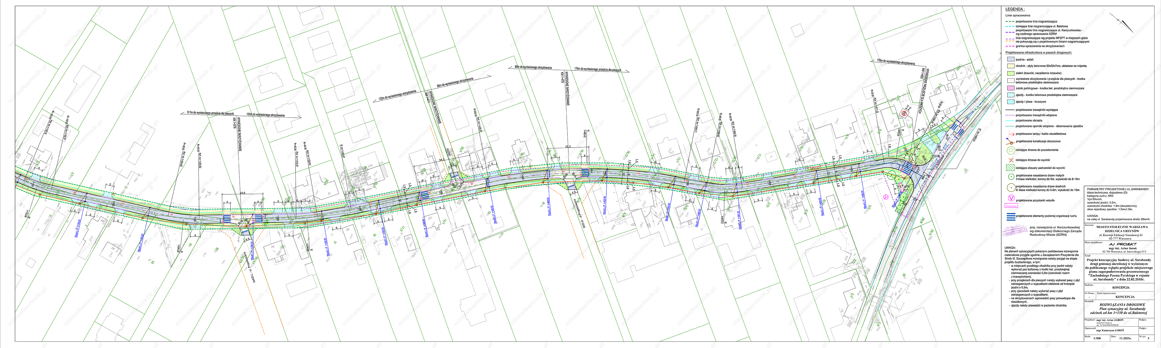 Przebudowa ul. Sarabandy na całym odcinku – od ul. Karczunkowskiej do ul. Baletowej – obejmuje budowę nowej jezdni w standardzie miejskim, chodników (częściowo oddzielonych pasami zieleni), zjazdów do posesji oraz pełnej infrastruktury towarzyszącej, w tym oświetlenia i odwodnienia. Projekt przewiduje również wyniesione przejścia i skrzyżowania, elementy poprawiające bezpieczeństwo ruchu oraz rozwiązania retencyjne dla wód opadowych, szczególnie w rejonie Kanału Jeziorki. Inwestycja zakłada także uporządkowanie zieleni przyulicznej oraz spójne powiązanie z istniejącym układem drogowym, co ma usprawnić komunikację i zwiększyć bezpieczeństwo mieszkańców.